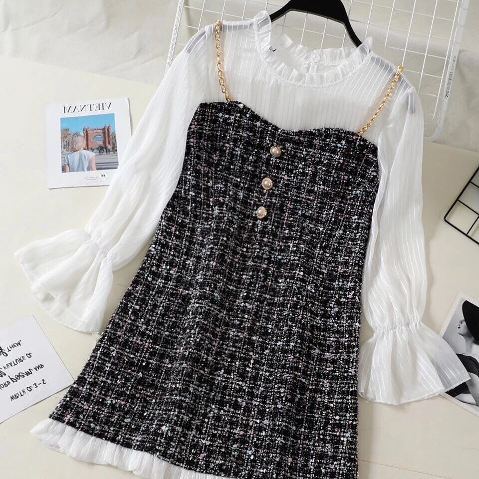 とても可愛らしいフェミニンなワンピース❤︎ 品のあるツイード生地とシフォンブラウスの組み合わせで、愛されコーデの出来上がりです♡ パールボタンやチェーン紐、一つ一つにこだわりのあるデザインなのも嬉しいポイント♪