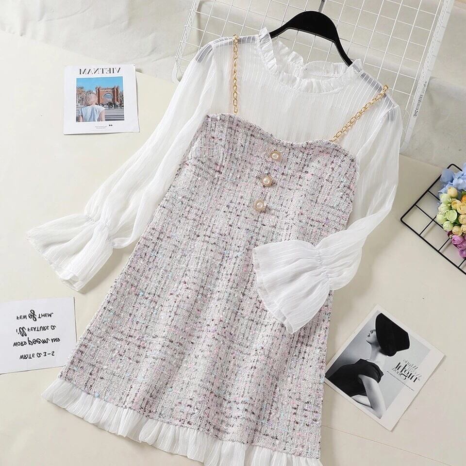 とても可愛らしいフェミニンなワンピース❤︎ 品のあるツイード生地とシフォンブラウスの組み合わせで、愛されコーデの出来上がりです♡ パールボタンやチェーン紐、一つ一つにこだわりのあるデザインなのも嬉しいポイント♪