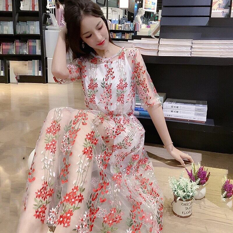 フラワー刺繍入りメッシュワンピース(ブラック)◉