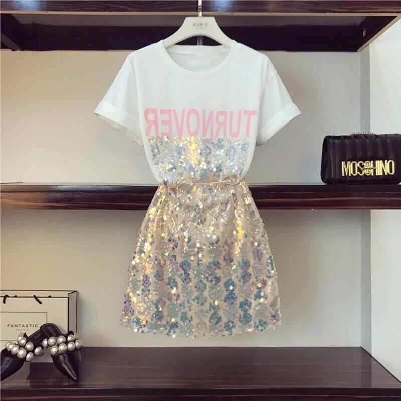 スパンコールプリントTシャツ&ミニスカート(ホワイト)◉