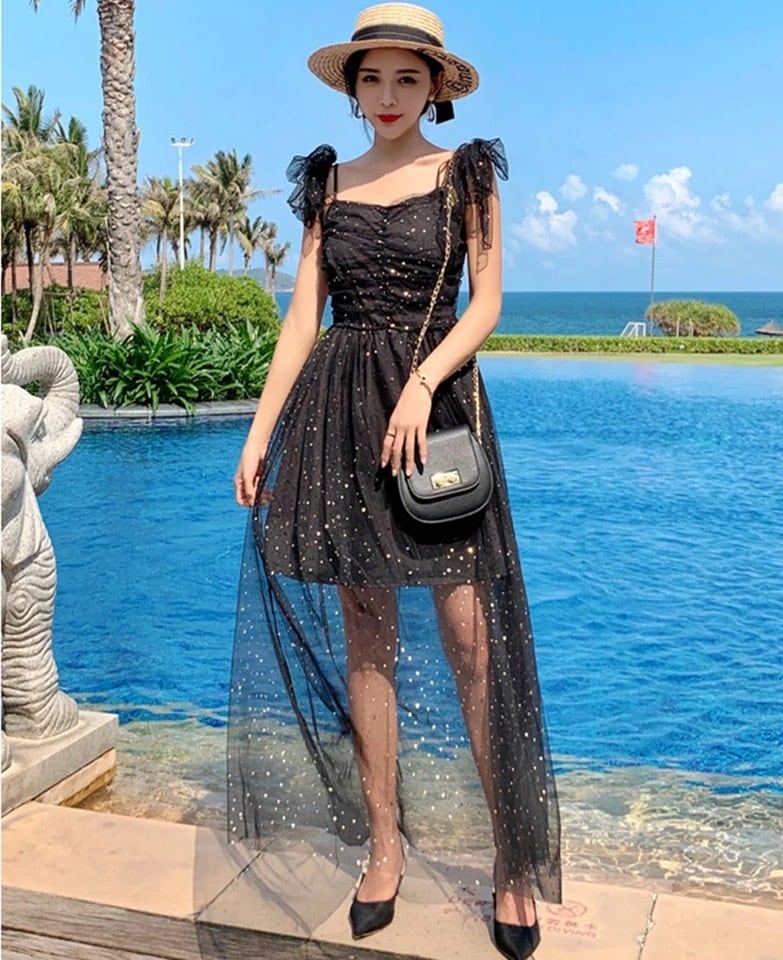 スパンコールがキラキラと輝くロングワンピース☆ シースルーの透け感がとってもセクシー❤︎ ブラックが更に女性の魅力を引き出してくれます♪ 夏コーデとしてビーチやリゾートにもおすすめな一枚です!